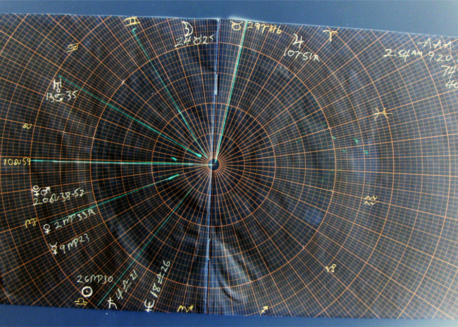 This simile of the horse trines (120 ) retrograde Jupiter (10Aries 51), introspective Lord of Heaven, alone in the western sky, high in the ninth house, where knowledge is solace. Here is the memory, fragile as a moth wing, of a past life among the shramanas (ascetics) in mystery groves north of India. Those specificities don’t matter now, they were so long ago, those wanderings through a fecund landscape etched in the blood; at that time, I was seeking, by charity among warm rains, old stone pools and giant banyans, serenity in the suffering world – yet, as frail a shadow in the blood as that memory is, I could not otherwise find the true words now to love what I live if I had not fulfilled my vow of silence then. Sun (26Virgo30) illuminates the second house and the value of consciousness as a transparent object. Sentences (whose only virtue is value, the worth of their meaning) – sentences begin here, somewhere inside this clear luminosity, somewhere in this house of value ... where I’ve been rummaging around since I was five. All those many years thinking stories were enough, struggling with sentences, fitting together signifiers, hoping to make meaning... Moon (24Taurus25) in the tenth house of career reflects all that meaning I tried to make with those sentences. I should have a career that’s over the Moon! Alas, the sign occupied by the Moon is intercepted, without access to a cusp, a doorway out of the house and into the world. The Bull of Heaven that killed Enkidu, the best friend of the majestic hero in the world’s first written story, has no way out. It tramples the Moon under hoof. And the Moon’s Mansion, without any earthly business, has become a netherworld in heaven, a lunatic asylum for all the meaningful things I thought were stories but were just me talking to myself. I might have known, with Neptune (18Libra26) in my third house of written communication precisely 144 from that locked up moon. 144 is 2/5th of a circle, the preeminent aspect of irrational love. All that mystic love for the unattainable underestimated practical things. What did I expect, writing uncanny stories (Neptune in the third) about the smokiest ranges of my soul (intercepted Moon) and addressing them to the whole world? Well, Pluto (20Leo38) conjunct Mars (20Leo52) in the first house of self provided tremendous courage for such dada ambitions: Ares in Hell. Who better to endure a thirty year pilgrimage across the baked floor of the dead? Venus (2Virgo33), paramour of Mars, moves retrograde across the cusp of the second house, the treasure house, wanting to bring everything precious to her lover in hell. Good luck. Even her beauty cannot inspire enough strength to fight phantoms. Nearby, Mercury (9Virgo23), hermetic trickster, goads her on and sometimes even convinces me she is my immortal soul and something like starlight, with the stamina to endure unfathomed darkness. But Saturn (4Libra21), scythe-bearer, knows nothing is immortal, not even the gods, let alone the stories from inside the mother of myself. In his low voice, old Cronos, terrible crow promises without joy or sorrow, “Time will tell,” knowing full well this far along there are more ghosts than time for me. In the radiant waste of dreams, the Father of All the Gods, Uranus (13Cancer35) watches silently from beyond the Twelfth Gate that guards the infinite. He hears my spirit singing.