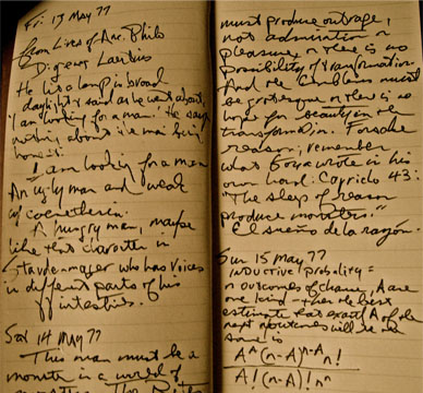 Originally titled Emblems and Rites, my notebook for Radix begins with this entry: Friday 13 May 1977 from Lives of Ancient Philosophers, Diogenes Laertius: He lit a lamp in broad daylight and said as he went about, ‘I am looking for a man.’ He says nothing about ‘the man’ being honest. I am looking for a man. An ugly man and weak with coenesthesia [a dysfunctional state of undifferentiated awareness of one’s body]. A hungry man, maybe like that character in Staudenmayer who has voices in different parts of his intestines.
